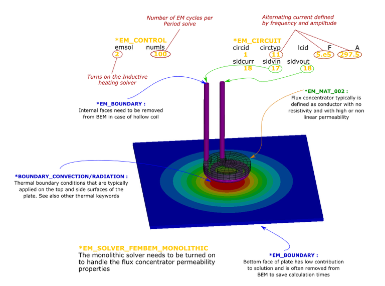 This LS-DYNA simulation shows a simple pancake coil + flux concentrator inductive heating problem. The Monolithic solver must be turned on in order to handle the zero conductivity/high permeability properties of the flux concentrator. Its presence allows a stronger concentration of the magnetic field close to the coil and therefore will generate more heat in the workpiece.