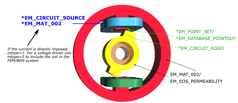 To solve this problem, either the current is considered a known quantity and directly imposed (see current_team24.k). In that case, the coil is not part of the FEM/BEM system (The current generates a external source term on the FEM/BEM system) and therefore mtype=1 in the coil's associated EM_MAT. The alternative is to use a voltage driven coil. In that case, the current is considered as an unknown and therefore mtype=2 in the coil's associated EM_MAT. In addition to the voltage, the resistance and the number of turns must also be provided in EM_CIRCUIT_SOURCE.